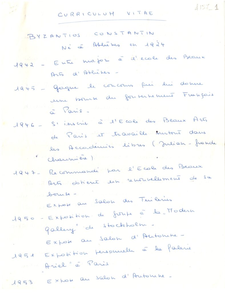 Βιογραφικό, χειρόγραφο, χαρτί, 2 φφ, 27×21 εκ., στα γαλλικά, του Κωνσταντίνου (Ντίκου) Βυζάντιου.