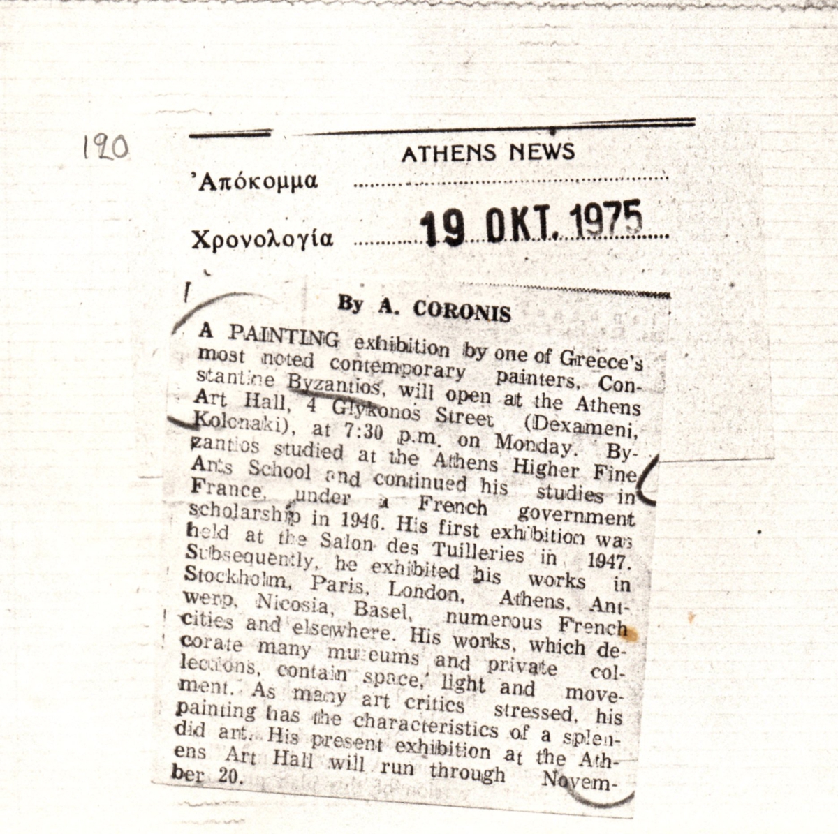 Φωτοαντίγραφο αποκόμματος, χαρτί, 29,5×21 εκ., στα αγγλικά, δημοσίευσης κριτικής έκθεσης του Κωνσταντίνου Βυζάντιου, η οποία διεξάγεται στην Αίθουσα Τέχνης Αθηνών.