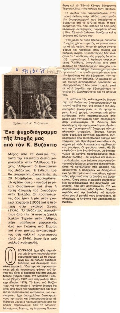 Απόκομμα, χαρτί ακανόνιστου μεγέθους, στα ελληνικά, δημοσίευσης κριτικής έκθεσης του Κωνσταντίνου (Ντίκου) Βυζάντιου, η οποία διεξάγεται στην Αίθουσα Τέχνης Αθηνών, το 1975.