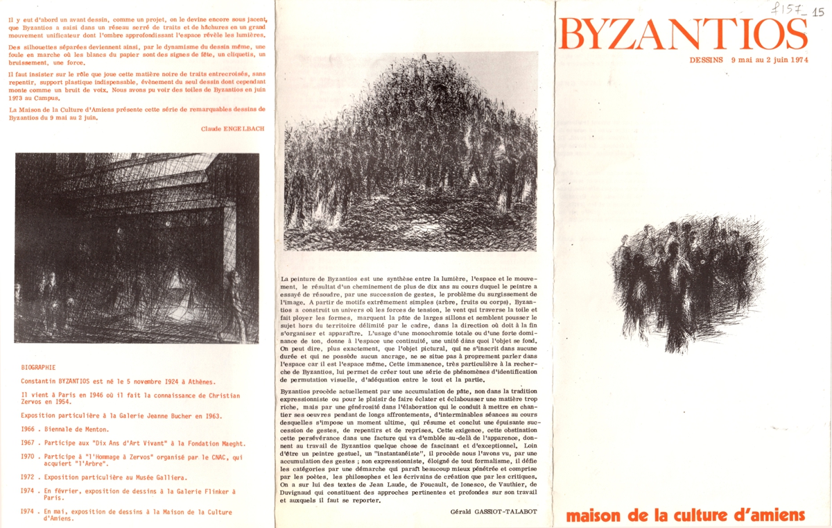 Έντυπο, χαρτόνι τρίπτυχο, 26,5×14 εκ., στα γαλλικά, ατομικής έκθεσης του Κωνσταντίνου Βυζάντιου στη Maison de la culture d’ Amiens. Το έντυπο περιέχει κριτικές για τον καλλιτέχνη, βιογραφικό και εικονογράφηση.