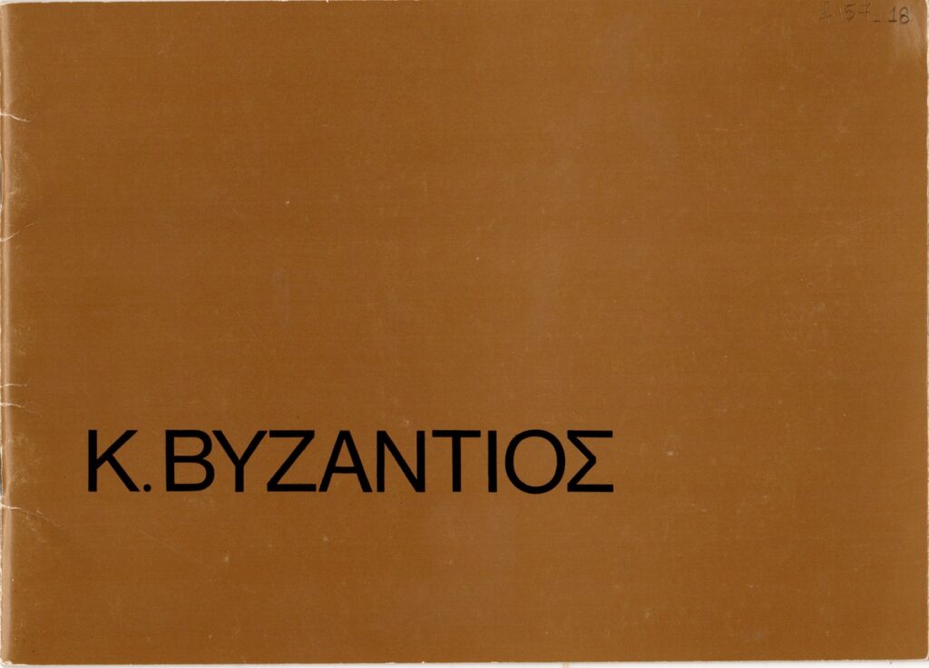 Έντυπο, χαρτί ιλλουστρασιόν, 10 φφ, 18×25 εκ., στα ελληνικά, ατομικής έκθεσης του Κωνσταντίνου Βυζάντιου στην Αίθουσα Τέχνης Αθηνών.