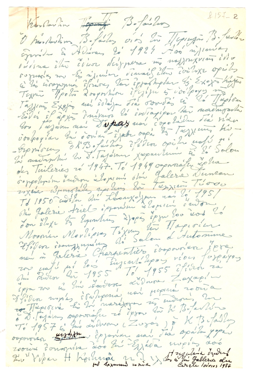 Βιογραφικό, χειρόγραφο, χαρτί, 29,5×19,5 εκ., του Κωνσταντίνου Βυζάντιου.