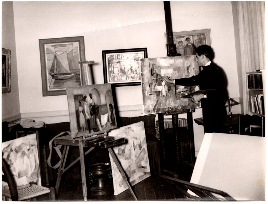Φωτογραφία, α/μ, φωτογραφικό χαρτί, 18×24 εκ., του Κωνσταντίνου (Ντίκου) Βυζάντιου, μπροστά από έργα του στο εργαστήριό του.