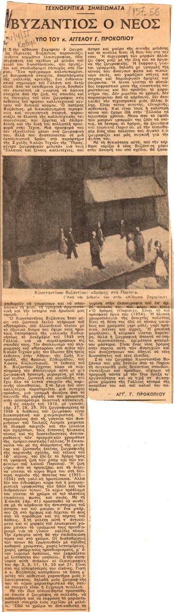 Απόκομμα, χαρτί, 36,5×10,5 εκ., στα ελληνικά, δημοσίευσης κριτικής για τον Κωνσταντίνο Βυζάντιο και το έργο του. Εντάσσεται στη στήλη “Τεχνοκριτικά σημειώματα” του εντύπου και εικονογραφείται