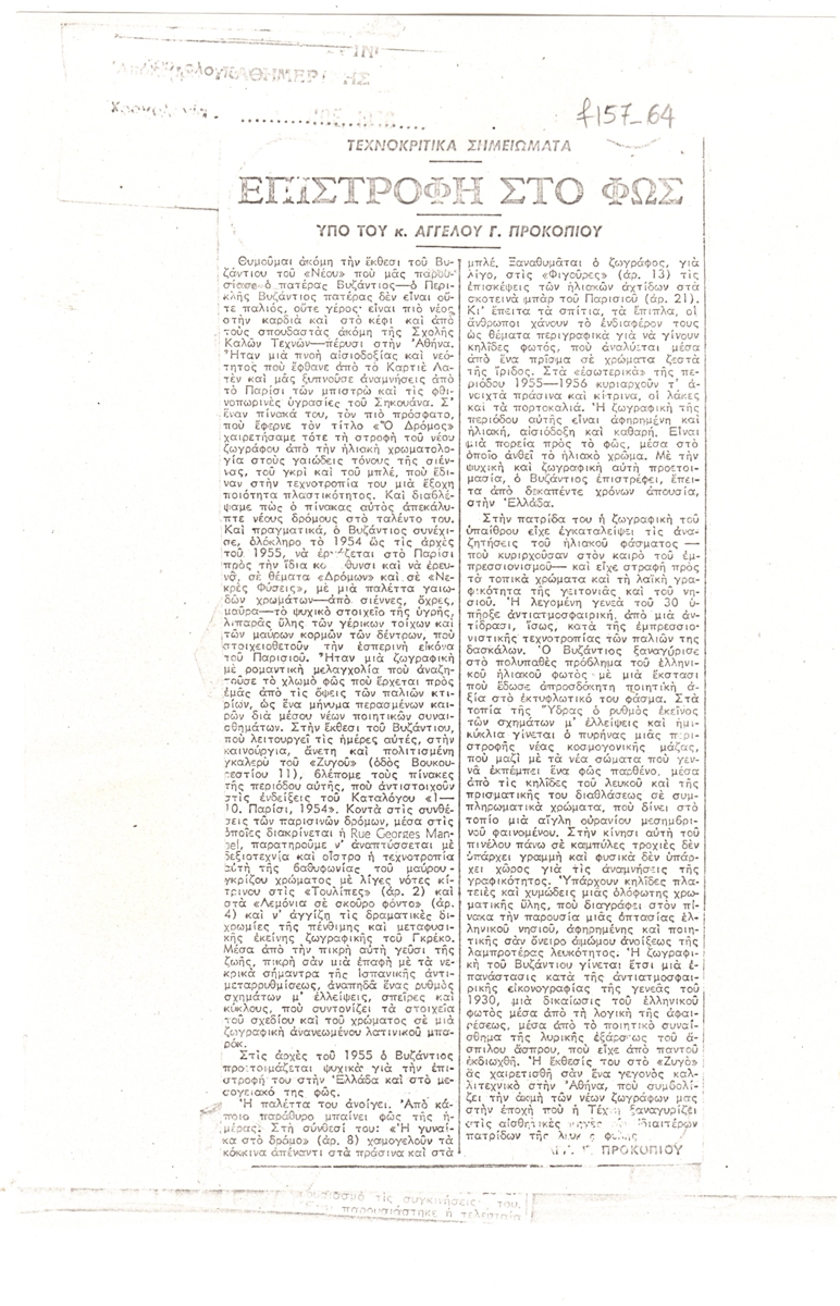 Φωτοαντίγραφο, χαρτί, 25×17 εκ., στα ελληνικά, δημοσίευσης κριτικής έκθεσης του Κωνσταντίνου Βυζάντιου, η οποία διεξάγεται στην Γκαλερί Ζυγός στην Αθήνα.