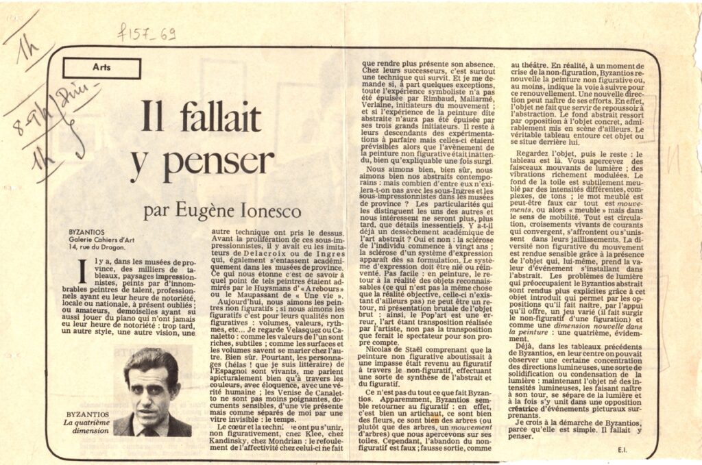 Απόκομμα, χαρτί, 19×29 εκ., στα γαλλικά, δημοσίευσης κριτικής του Ευγένιου Ιονέσκο, για τον Κωνσταντίνο Βυζάντιο και το έργο του με αφορμή έκθεσή του στην Galerie Cahiers d’ Art στο Παρίσι, το 1965.