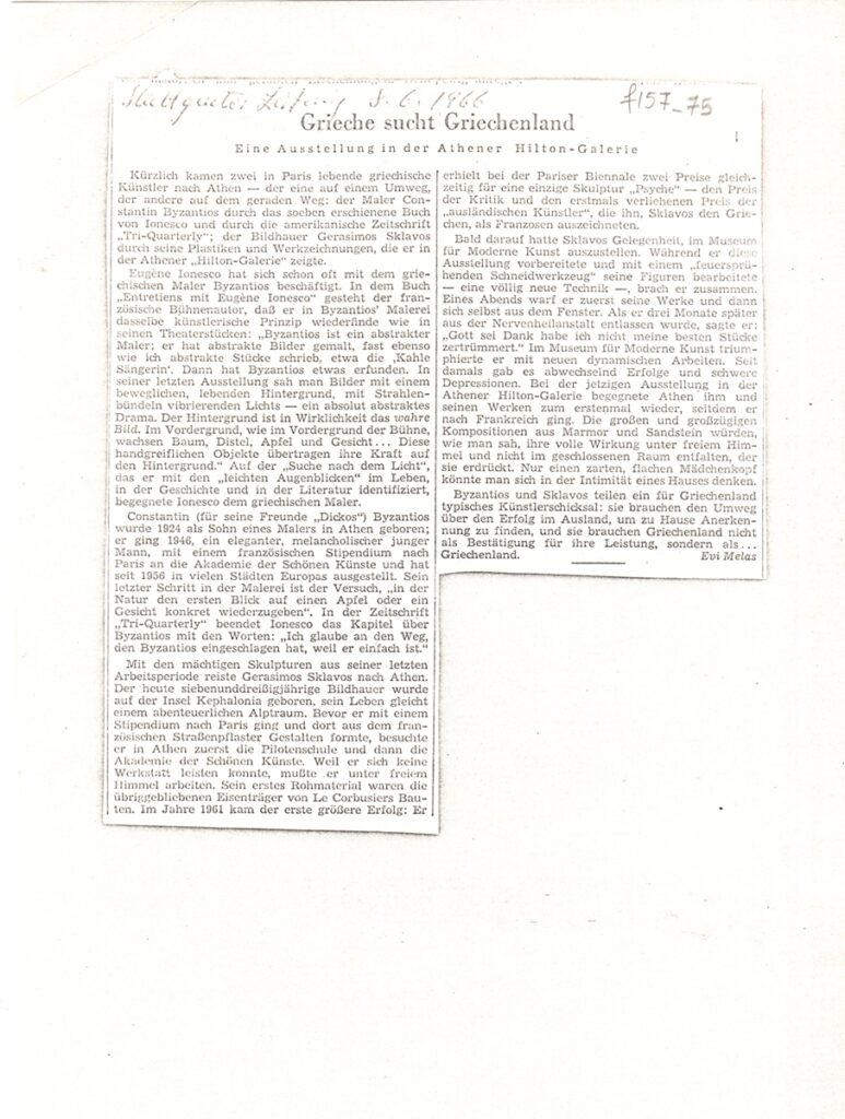 Φωτοαντίγραφο, χαρτί, 28×21 εκ., στα γερμανικά, δημοσίευσης κριτικής έκθεσης του Κωνσταντίνου Βυζάντιου στην Αίθουσα Χίλτον στην Αθήνα.