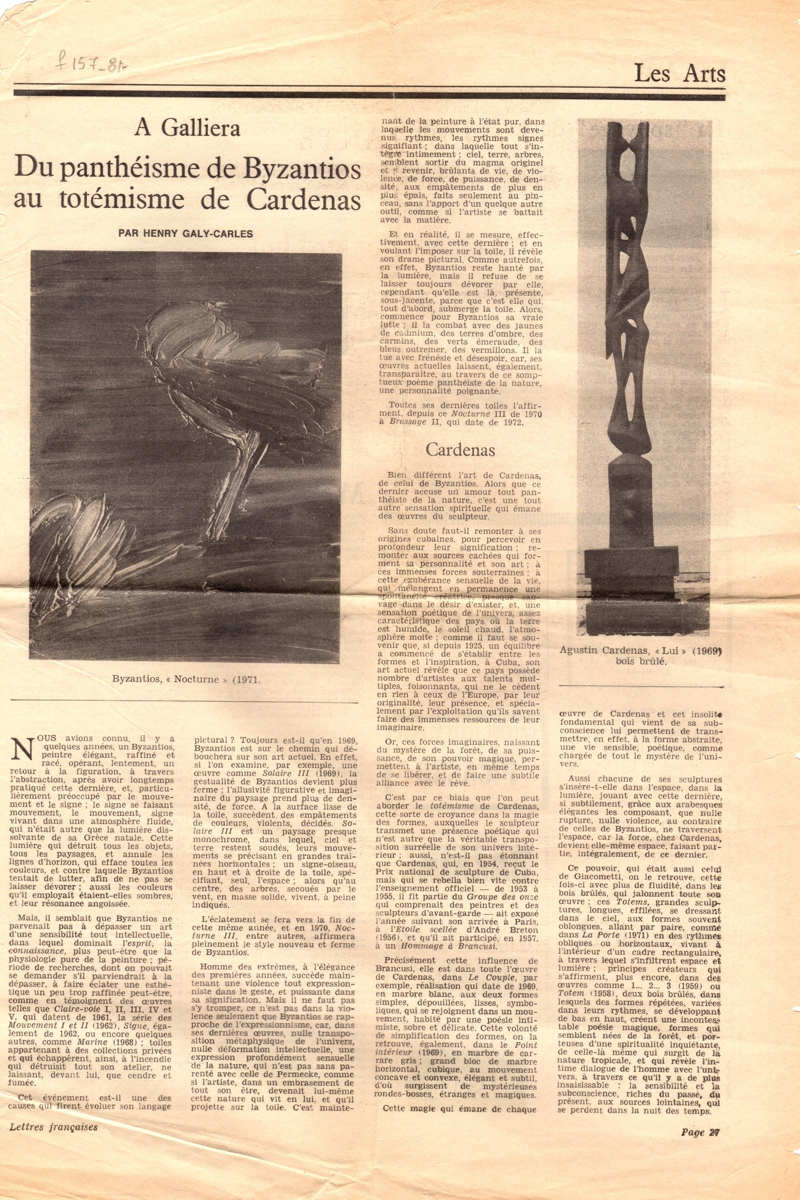 Απόκομμα, χαρτί, 43×29,5 εκ., στα γαλλικά, δημοσίευσης κριτικής εκθέσεων των Κωνσταντίνου Βυζάντιου και Agustin Cardenas, οι οποίες διεξάγονται στο Μουσείο Galliera στο Παρίσι.