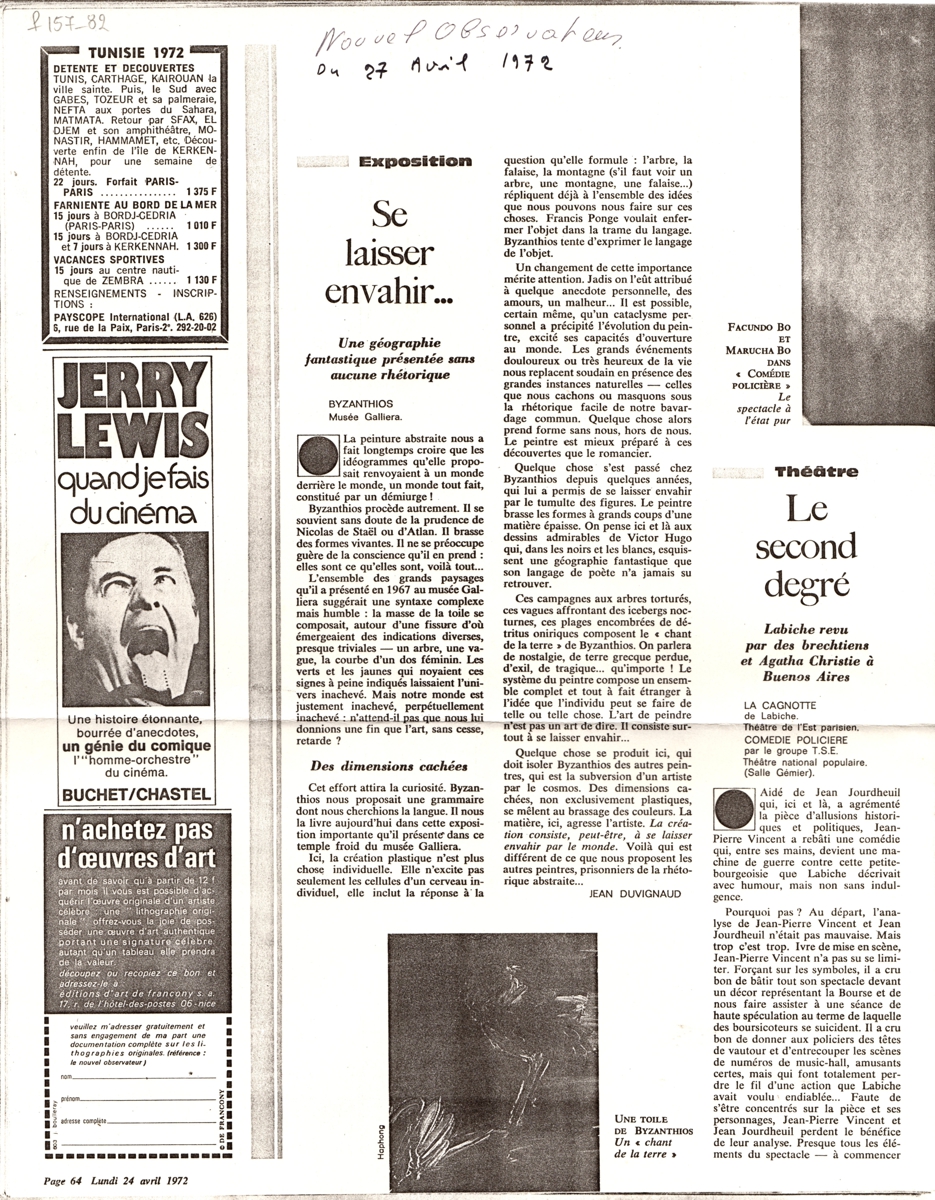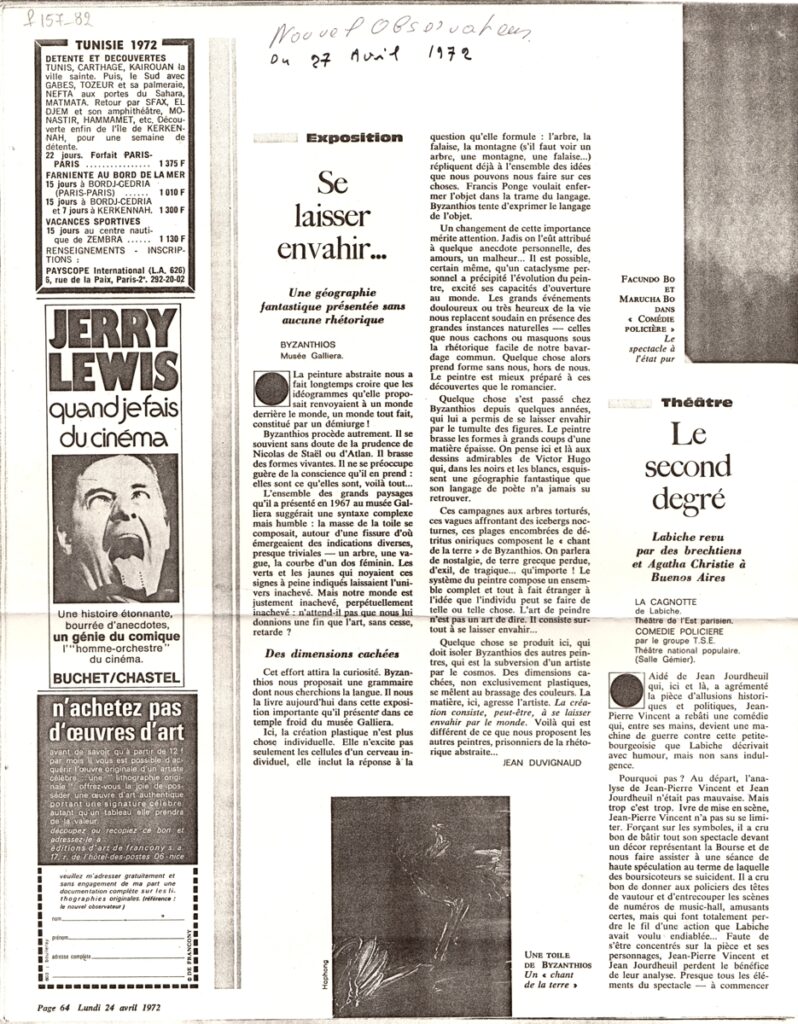 Φωτοαντίγραφο, χαρτί, 35×30 εκ., στα γαλλικά, δημοσίευσης κριτικής έκθεσης του Κωνσταντίνου (Ντίκου) Βυζάντιου, η οποία διεξάγεται στο Musée Galliera.