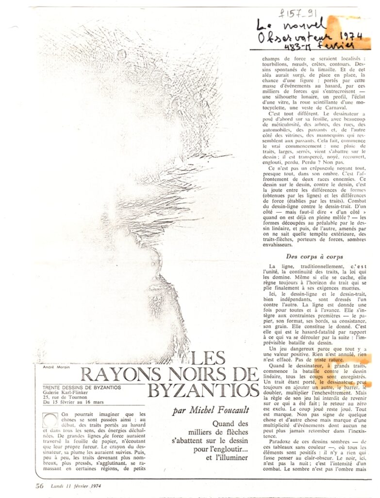 Φωτοαντίγραφο, χαρτί, 2 φφ, 31×21 και 31×9 εκ., στα γαλλικά, δημοσίευσης κριτικής έκθεσης του Κωνσταντίνου Βυζάντιου, η οποία διεξάγεται στην Gallerie Karl Flinker στο Παρίσι το 1974.