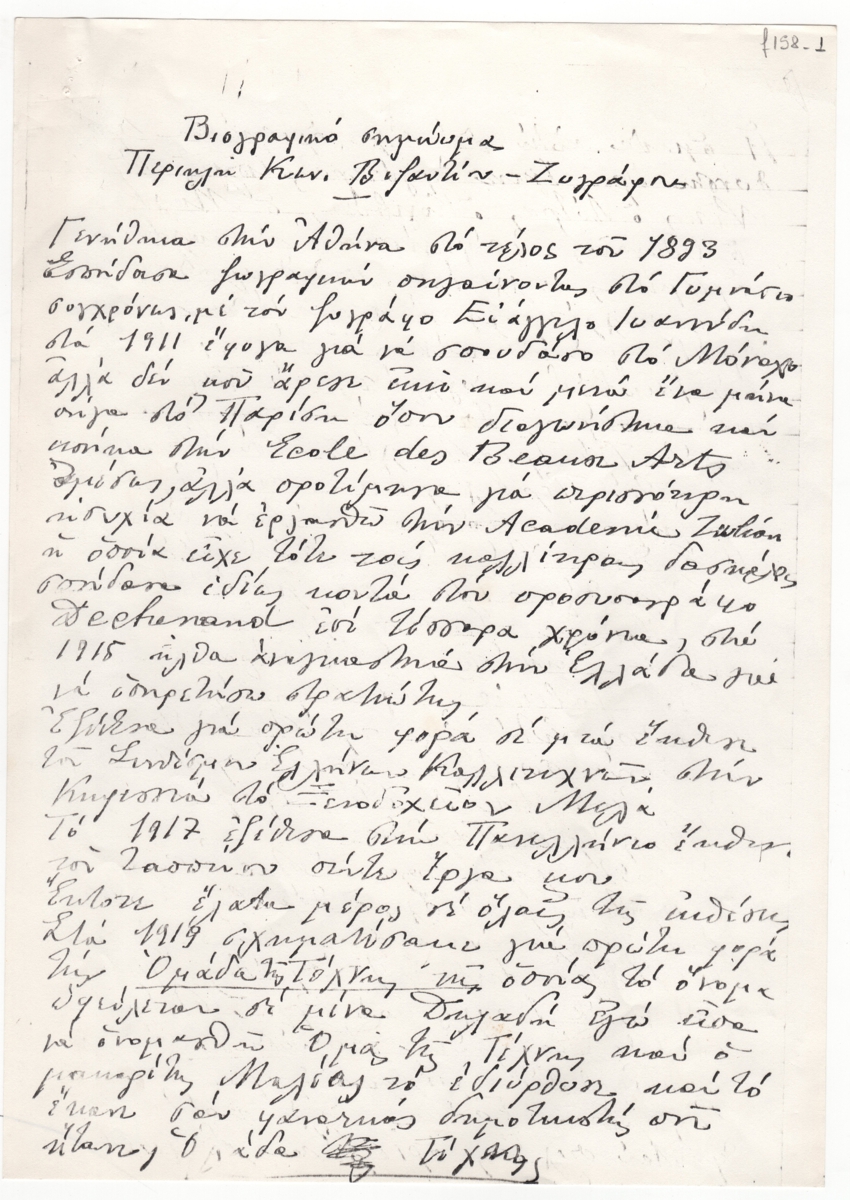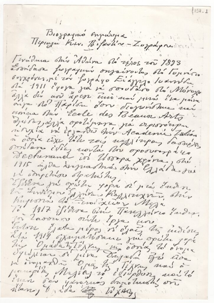 Φωτοαντίγραφο κειμένου, χειρόγραφου, χαρτί, 5 φφ, 30,0×21,0 εκ. Βιογραφικό του Περικλή Βυζάντιου σε πρώτο πρόσωπο, με λεπτομερή στοιχεία για τη ζωή και το έργο του. Πάνω στο κείμενο υπογραμμίσεις με μολύβι.