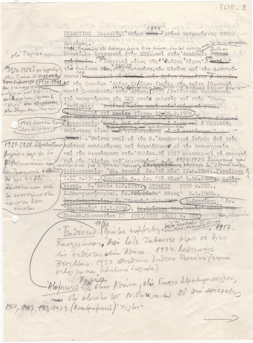 Κείμενο, δακτυλόγραφο, με διορθώσεις και συμπληρώσεις, χειρόγραφες, με μολύβι, στα ελληνικά, χαρτί, 28,8×21,2 εκ. Περιέχει πληροφορίες για τις σπουδές του καλλιτέχνη, τις ατομικές του εκθέσεις, εργογραφία και βιβλιογραφία.