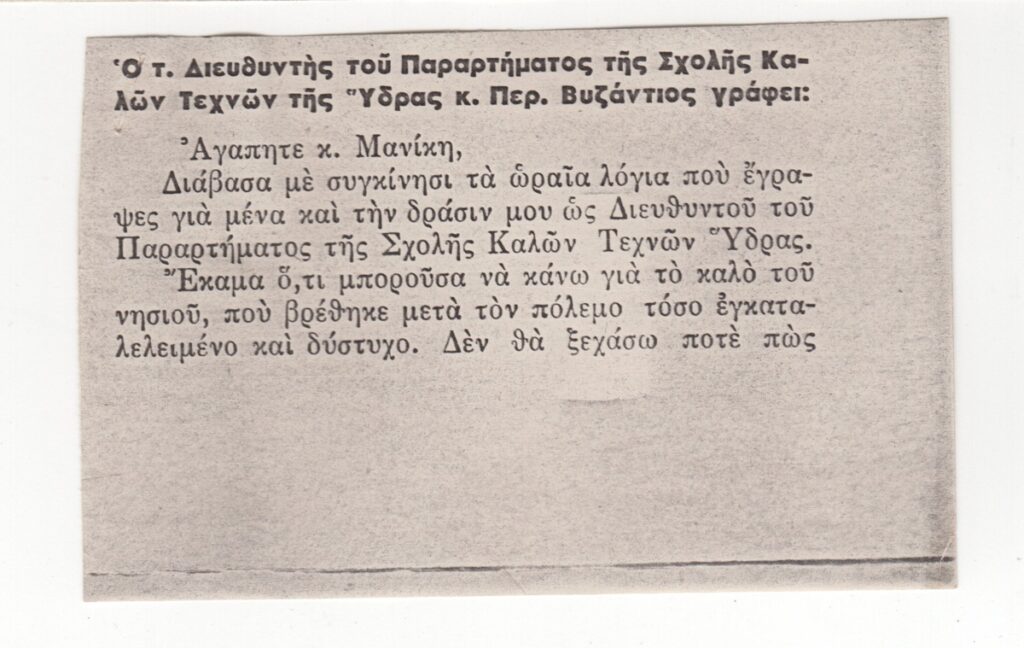 Φωτοαντίγραφο αποκόμματος εντύπου, χαρτί, 2 φφ, 29,8×21,0 εκ., στα ελληνικά. Ευχαριστήρια επιστολή του Περικλή Βυζάντιου προς τον κ. Μανίκη για το εγκώμιο για τη δράση του ως διευθυντή του Παραρτήματος της Σχολής Καλών Τεχνών Ύδρας. Περιγράφει την κατάσταση του νησιού μετά τον πόλεμο και τις ενέργειές του για την αναβίωσή του και τη λειτουργία του εκεί παραρτήματος. Παραθέτει ευχαριστήρια επιστολή από τον Γ. Τούγια με την ιδιότητα του ως προέδρου της Ένωσης Σπουδαστών Ανωτάτης Σχολής Καλών Τεχνών προς το πρόσωπό του και απαντητική επιστολή. Στο πάνω μέρος της σελίδας επιγραφή.