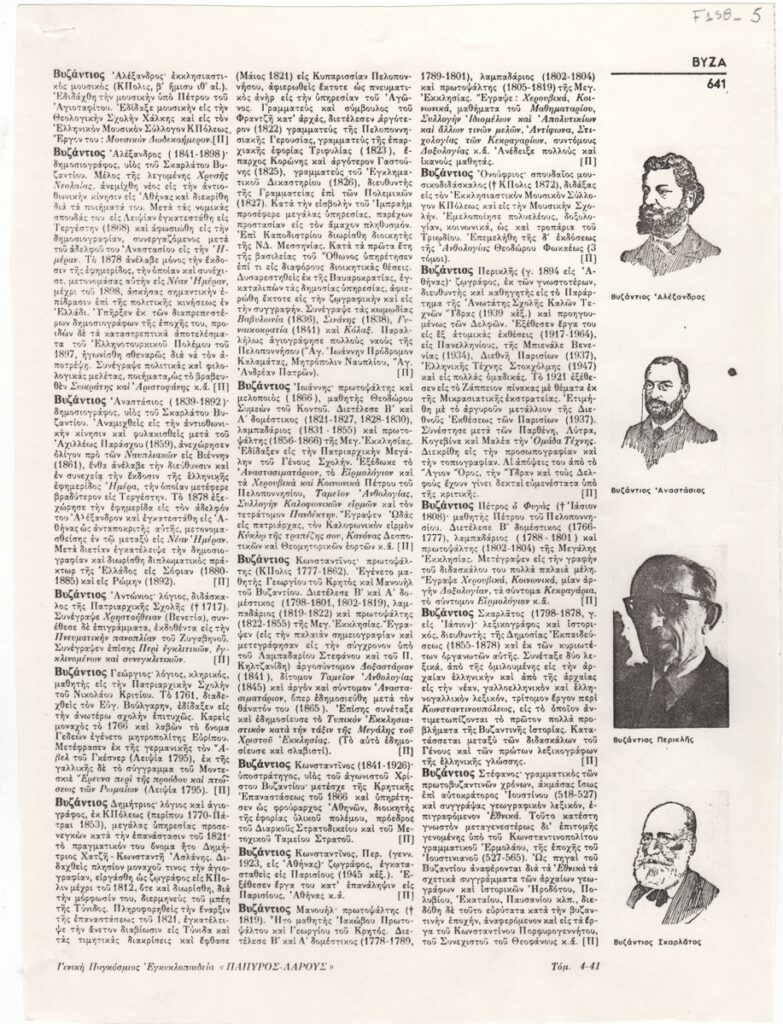 Φωτοαντίγραφο σελίδας εγκυκλοπαίδειας, χαρτί, 29,021,2 εκ. Η σελίδα περιέχει εγκυκλοπαιδικά λήμματα για τους: Βυζάντιο Αλέξανδρο έως Βυζάντιο Στέφανο. Εκονογραφείται με σκίτσα τεσσάρων από τα πρόσωπα που αναφέρονται στα λήμματα.