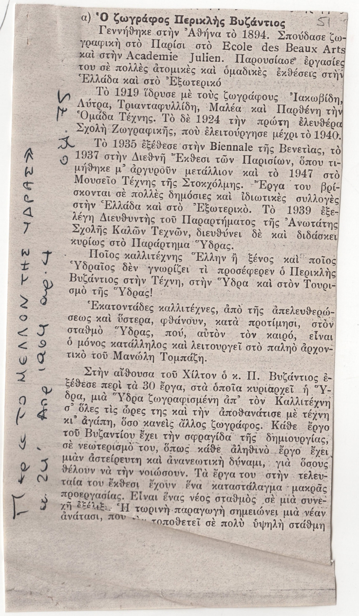 Φωτοαντίγραφο αποκομμάτων, χαρτί, δύο τμήματα, 19,0×10,2 και 12,2×11,0 εκ, στα ελληνικά. Σύντομο βιογραφικό και κριτική του έργου του καλλιτέχνη. Στο πλάι του πρώτου αποκόμματος επιγραφή.