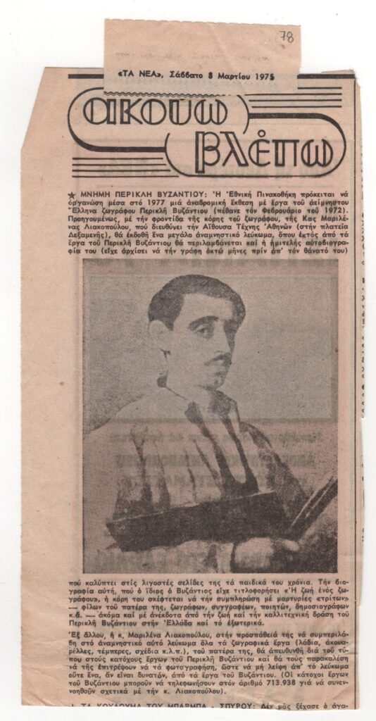 Απόκομμα εφημερίδας, χαρτί, 23,5×12,0 εκ., στα ελληνικά. Το δημοσίευμα αφορά την οργάνωση αναδρομικής έκθεσης με έργα του καλλιτέχνη και την έκδοση μεγάλου αναμνηστικού λευκώματος με την επιμέλεια της κόρης του Μαριλένας Λιακοπούλου. Εικονογραφείται με αναπαραγωγή έργου του καλλιτέχνη.