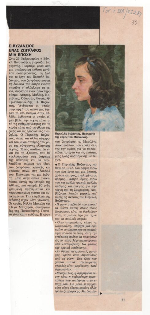 Απόκομμα περιοδικού, χαρτί ιλουστρασιόν, 29,6×13,2 εκ., στα ελληνικά. Το δημοσίευμα αφορά την αναδρομική έκθεση με έργα του καλλιτέχνη στην Εθνική Πινακοθήκη. Περιέχει αποσπάσματα από κείμενα του καλλιτέχνη και απόσπασμα συνέντευξης της κόρης του Μαριλένας Λιακοπούλου. Στο ίδιο δημοσίευμα γίνεται αναφορά στην έκθεση της Β. Κατράκη στην Αίθουσα Τέχνης Αιξωνή, του Διονύση Καρατζά στον Εικαστικό Χώρο, της Μίνας Καμπανέλη στην γκαλερί Υδροχόος, της Ναυσικάς Πάστρα στην αίθουσα τέχνης Μέδουσα και της Ελένης Μπίλια στην γκαλερί Συν. Στο ίδιο απόκομμα απόσπασμα άρθρου σχετικά με συναυλία του Μίκη Θεόδωράκη με ερμηνεύτρια της Αλίκη Καγιαλόγου στο Γαλλικό Ινστιτούτο Αθηνών. Τα άρθρα εικονογραφούνται με αναπαραγωγές έργων και φωτογραφιών.