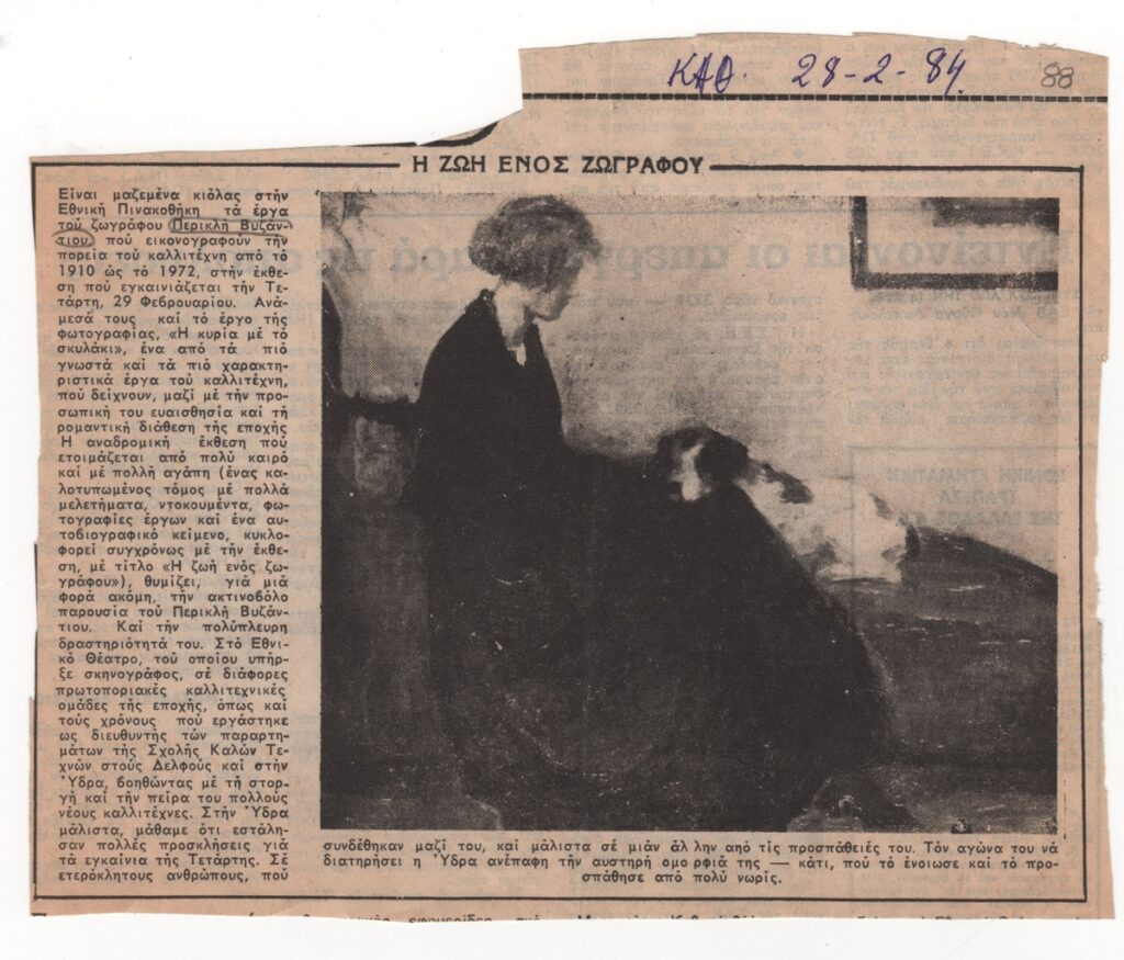 Απόκομμα εφημερίδας, χαρτί, 16,0×19,0 εκ., στα ελληνικά. Δημοσίευμα για τα εγκαίνια της αναδρομικής έκθεσης έργων του καλλιτέχνη στην Εθνική Πινακοθήκη. Εικονογραφείται με αναπαραγωγή έργου. Στην κορυφή του αποκόμματος επιγραφή.