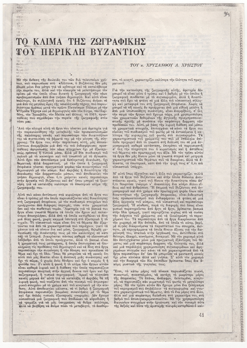 Φωτοαντίγραφο αποκόμματος εντύπου, χαρτί, 29,7×21,2 εκ., στα ελληνικά. Απόσπασμα άρθρου του Χρ. Χρήστου, κριτική έκθεσης έργων του καλλιτέχνη στην γκαλερί του “Χίλτον”.