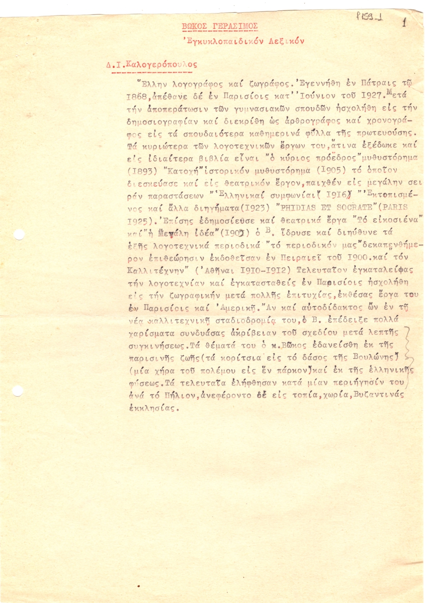 Αποδελτίωση λήμματος, δακτυλόγραφο, χαρτί, 31×22 εκ., στα ελληνικά. Αναγράφεται βιογραφικό σημείωμα του Γεράσιμου Βώκου.