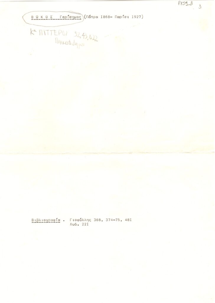 Σημειώσεις, δακτυλόγραφο, χαρτί, 29,5×21 εκ., στα ελληνικά. Περιέχει βιβλιογραφική παραπομπή σε κείμενα του Φώτου Γιοφύλλη και Στέλιου Λυδάκη, για τον Γεράσιμο Βώκο.
