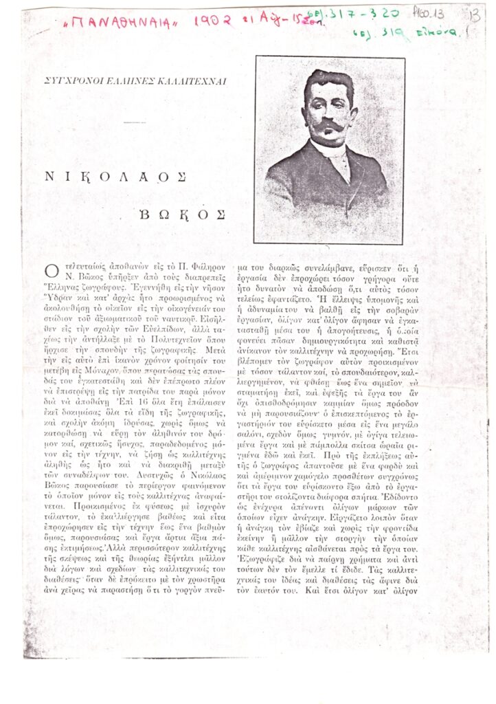 Φωτοαντίγραφο, χαρτί, 3 φφ, 26×19 και 10,5×19 εκ., στα ελληνικά, δημοσίευσης κειμένου για τον Νικόλαο Βώκο.