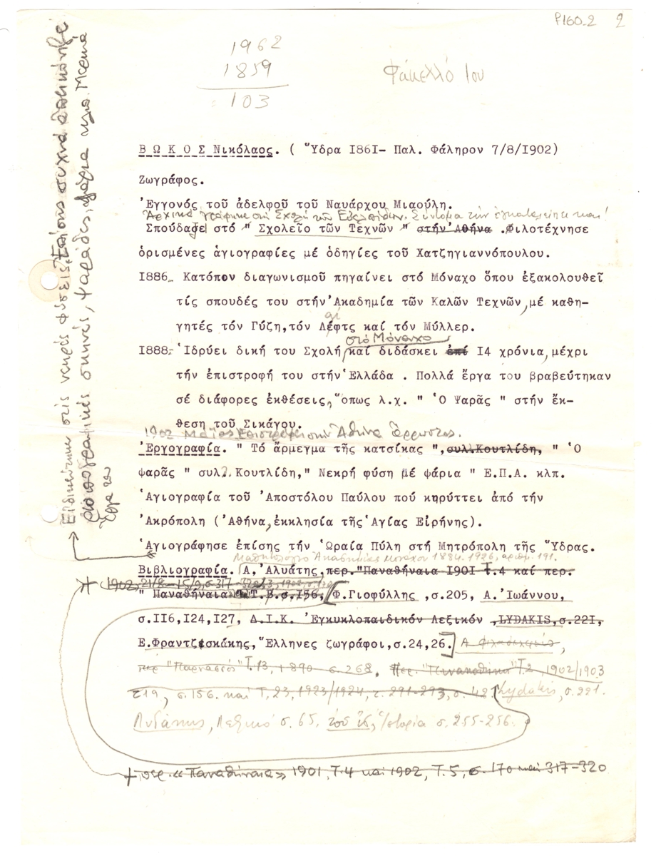 Βιογραφικό δακτυλόγραφο, χαρτί, 29×21 εκ., στα ελληνικά, του Νικόλαου Βώκου. Περιέχει προσωπικά στοιχεία, εργογραφία και βιβλιογραφία σβησμένη, με αναφερόμενους τους Στέλιο Λυδάκη, Φώτο Γιοφύλλη, Α. Αλυάτη, Α. Ιωάννου, Δ. Καλογερόπουλο, Ε. Φραντζισκάκη, στα “Παναθήναια”, “Πινακοθήκη”, “Εγκυκλοπαιδικό Λεξικό”, “Παρνασσός”, “Λεξικό Ελλήνων καλλιτεχνών”.