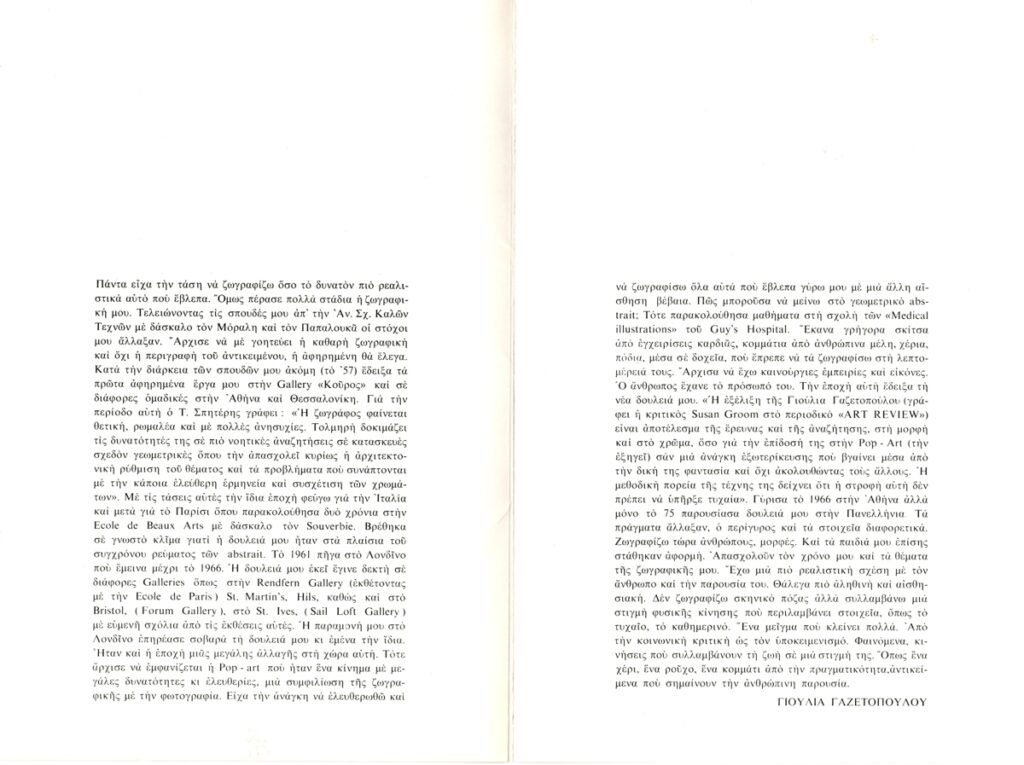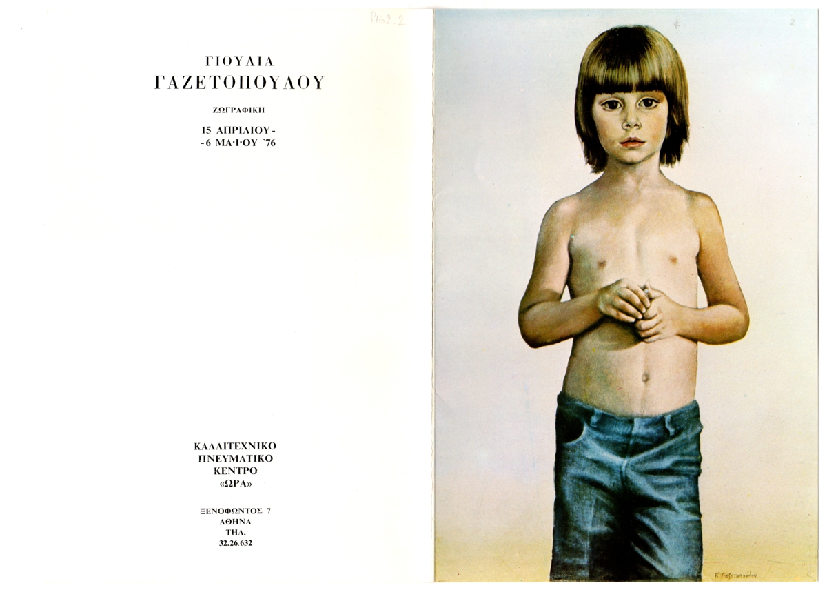Έντυπο, χαρτόνι αναδιπλωμένο, 24,5×16,5 εκ., στα ελληνικά, ατομικής έκθεσης της Γιούλιας Γαζετοπούλου, η οποία διεξάγεται στο Καλλιτεχνικό Πνευματικό Κέντρο Ώρα, στην Αθήνα το 1976.