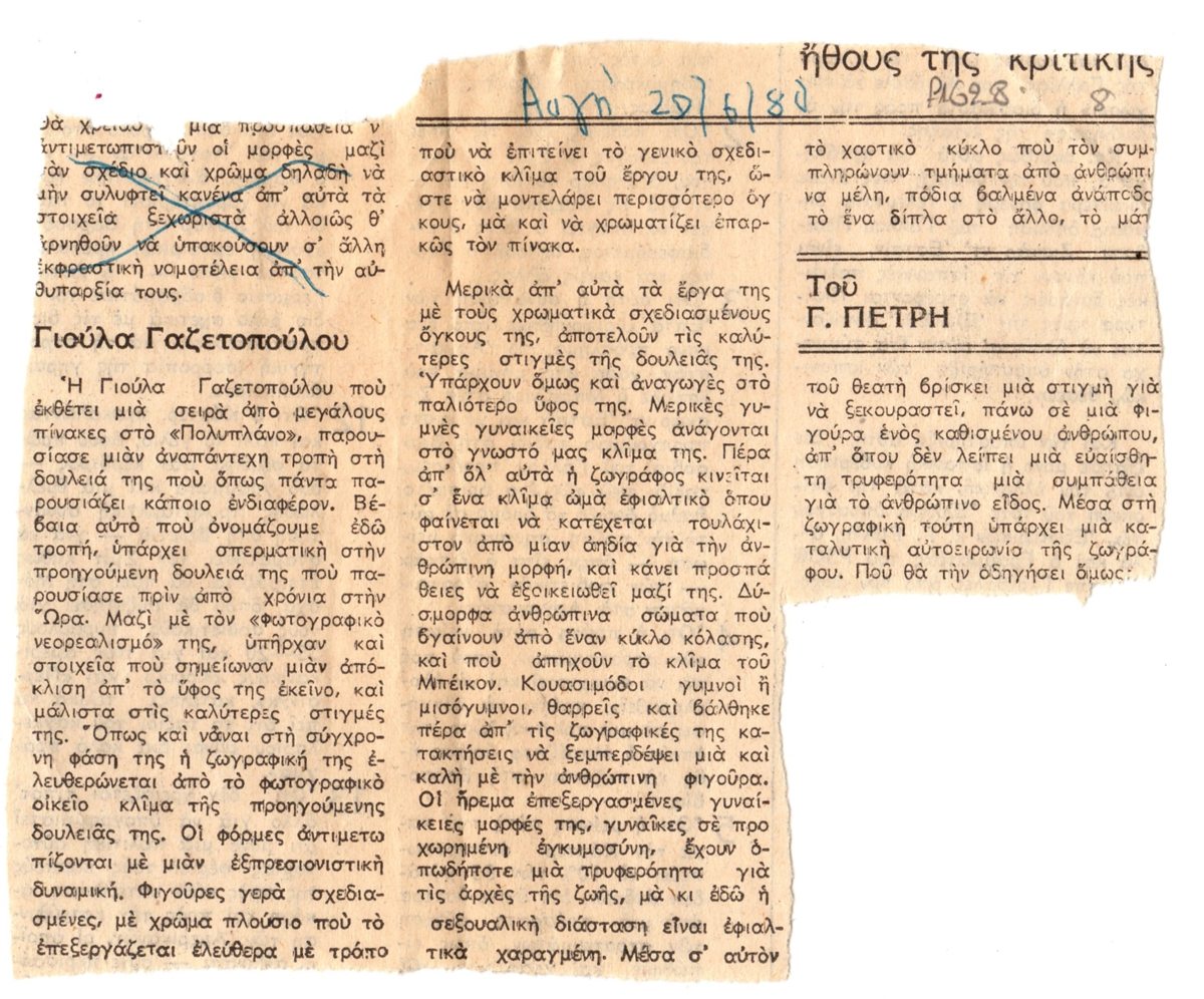 Απόκομμα, χαρτί, 12×15 εκ., στα ελληνικά, δημοσίευσης κριτικής για την ατομική έκθεση της Γιούλιας Γαζετοπούλου, η οποία διεξάγεται στην Αίθουσα Τέχνης Πολυπλάνο, το 1980.