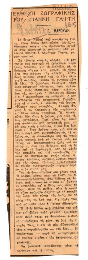 Απόκομμα, χαρτί, 18,5×5,5 εκ., στα ελληνικά, δημοσίευσης κριτικής έκθεσης του Γιάννη Γαΐτη, η οποία διεξάγεται στον Φιλολογικό Σύλλογο Παρνασσό, στην Αθήνα.