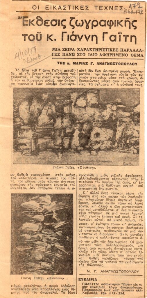 Απόκομμα, χαρτί, 22×11 εκ., δημοσίευσης κριτικής έκθεσης του Γιάννη Γαΐτη, στην γκαλερί Ζυγός στην Αθήνα, το 1959.
