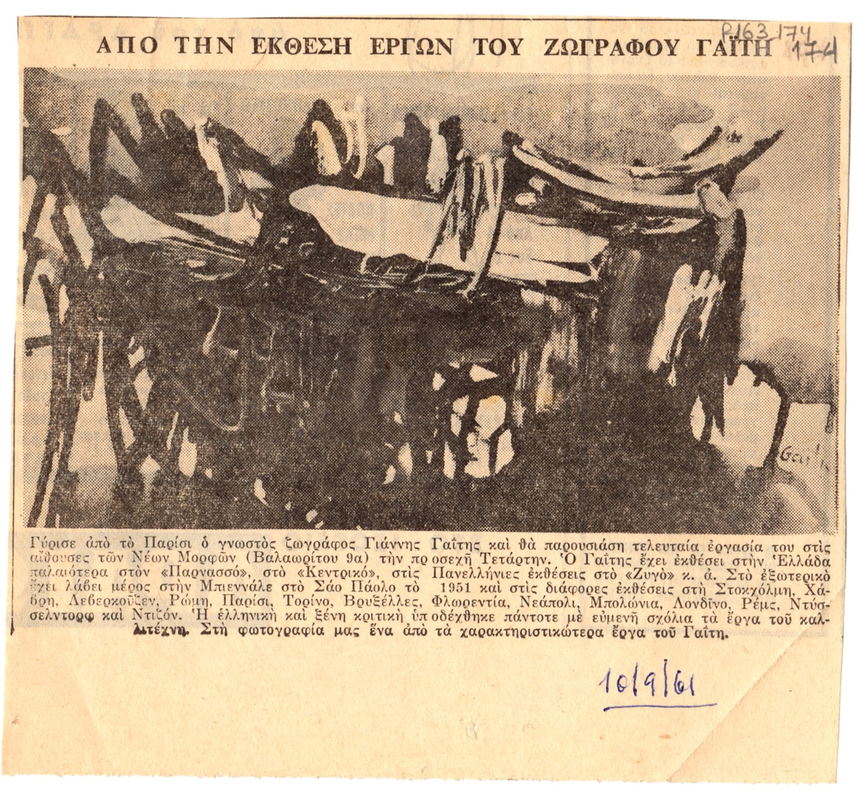 Απόκομμα, χαρτί, 14×15 εκ., στα ελληνικά, δημοσίευσης αναπαραγωγής έργου, το οποίο παρουσιάζεται μεταξύ άλλων σε έκθεση του καλλιτέχνη, στην Γκαλερί Νέες Μορφές στην Αθήνα.