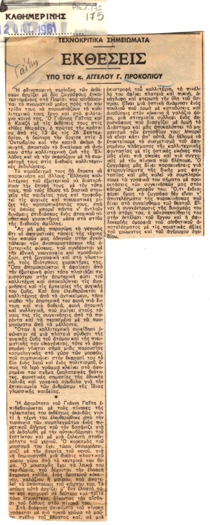 Απόκομμα, χαρτί, 27×10 εκ., στα ελληνικά, δημοσίευσης κριτικής έκθεσης του Γιάννη Γαΐτη, η οποία διεξάγεται στην Γκαλερί Νέες Μορφές στην Αθήνα το 1961.
