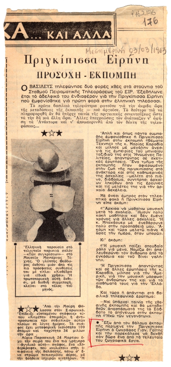 Απόκομμα, χαρτί, 22,5×10 εκ., στα ελληνικά, δημοσίευσης συνέντευξης της Πριγκίπισσας Ειρήνης σε ραδιοφωνική εκπομπή. Σημειώνεται πως ο Γιάννης Γαΐτης προσέφερε στο τέλος της εκπομπής στην πριγκίπισσα έργο του.