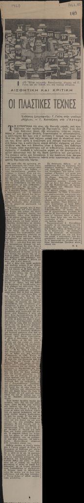 Απόκομμα, χαρτί, 62,5×10 εκ., στα ελληνικά, δημοσίευσης κριτικής για τις ατομικές εκθέσεις των Γιάννη Γαΐτη και Γιώργου Κονταξάκη, στις γκαλερί Μέρλιν και Άστορ αντίστοιχα, στην Αθήνα, το 1967. Εντάσσεται στη στήλη “Αισθητική και κριτική” του εντύπου.