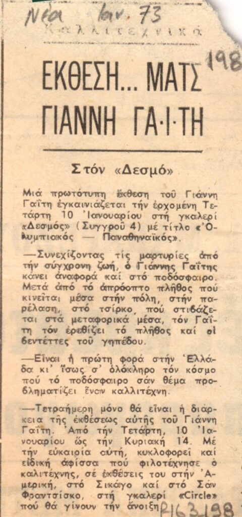 Απόκομμα, χαρτί, 11×5,5 εκ., στα ελληνικά, δημοσίευσης κριτικής έκθεσης του Γιάννη Γαΐτη, η οποία διεξάγεται στην Αίθουσα Τέχνης Δεσμός στην Αθήνα.