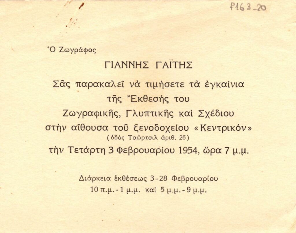 Πρόσκληση εγκαινίων ατομικής έκθεσης του Γιάννη Γαϊτη, στο ξενοδοχείο Κεντρικόν, στην Αθήνα.