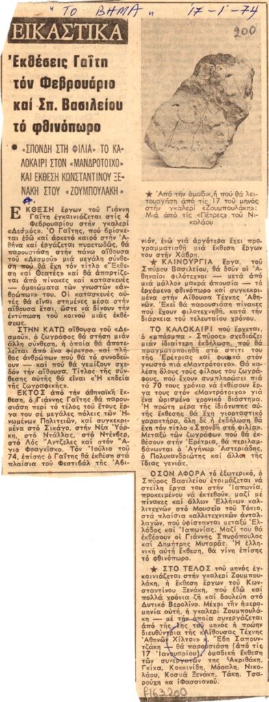Στο ίδιο, γίνεται αναφορά για την ατομική έκθεση του Σπύρου Βασιλείου στην Αίθουσα Τέχνης Αθηνών, στην ατομική έκθεση του Κωνσταντίνου Ξενάκη στην Γκαλερί Ζουμπουλάκη και στην ομαδική έκθεση καλλιτεχνών Ακριθάκη, Γκίκα, Κοκκινίδη, Μόραλη, Νικολάου, Κοσμά Ξενάκη, Τάκη, Τσαρούχη, Φασσιανού, στην γκαλερί Ζουμπουλάκη. Το κείμενο εντάσσεται στη στήλη “Εικαστικά” του εντύπου. Το απόκομμα φέρει επιγραφές.
