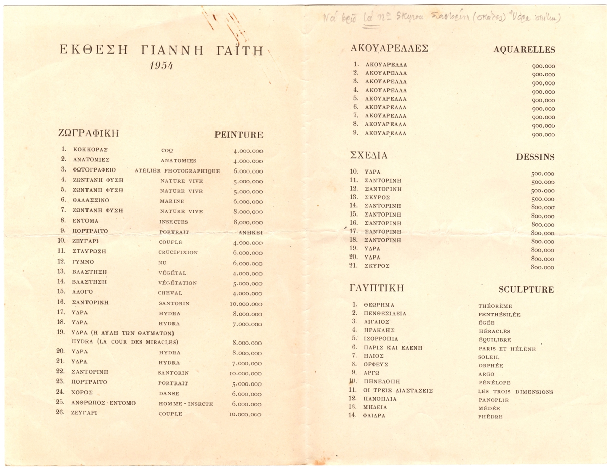 Τιμοκατάλογος έκθεσης, χαρτί αναδιπλωμένο, 20,5×13,5 εκ., στα ελληνικά με γαλλική μετάφραση, έργων του Γιάννη Γαΐτη, που παρουσιάζονται σε έκθεσή του στο Ξενοδοχείο Κεντρικόν.
