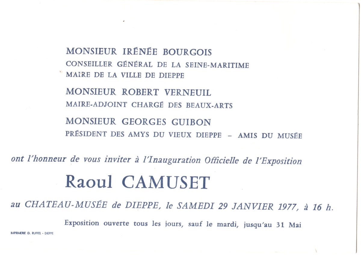 Πρόσκληση, χαρτί, 10,5×15,5 εκ., στα γαλλικά, εγκαινίων ατομικής έκθεσης του Raoul Camuset.