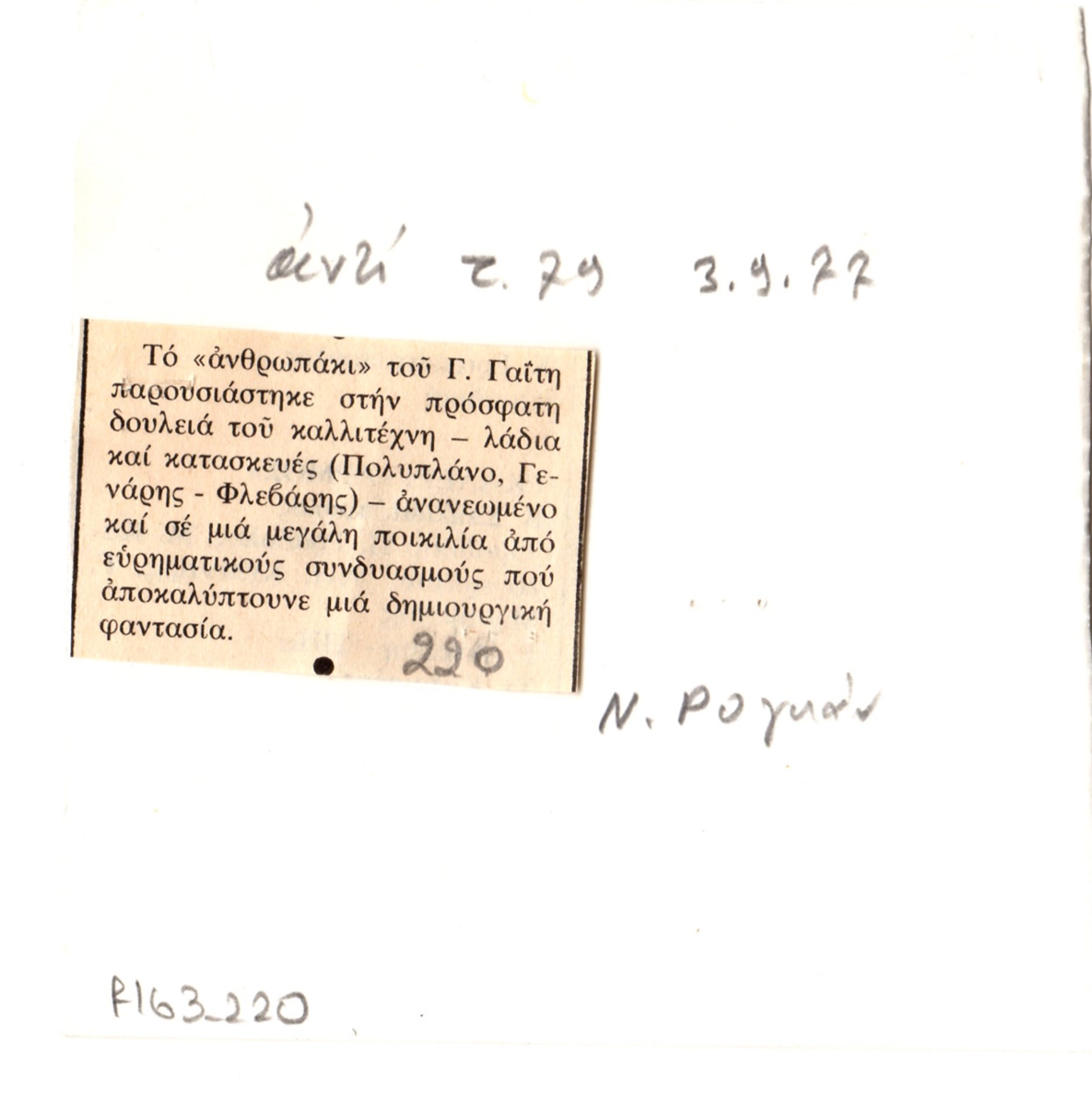 Απόκομμα, χαρτί, συραμμένο σε απόκομμα εντύπου, συνολικών διαστάσεων 10×10 εκ., στα ελληνικά, δημοσίευσης κριτικής έκθεσης του Γιάννη Γαΐτη, η οποία διεξάγεται στην Αίθουσα Τέχνης Πολυπλάνο στην Αθήνα.
