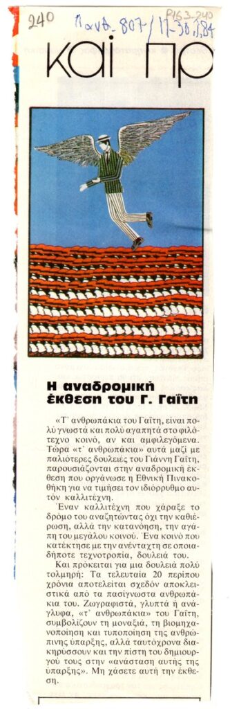 Απόκομμα του περιοδικού “Πάνθεον” (17/07/1984), όπου δημοσιεύεται κριτική έκθεσης του Γιάννη Γαΐτη, η οποία διεξάγεται στην Εθνική Πινακοθήκη Αθηνών.