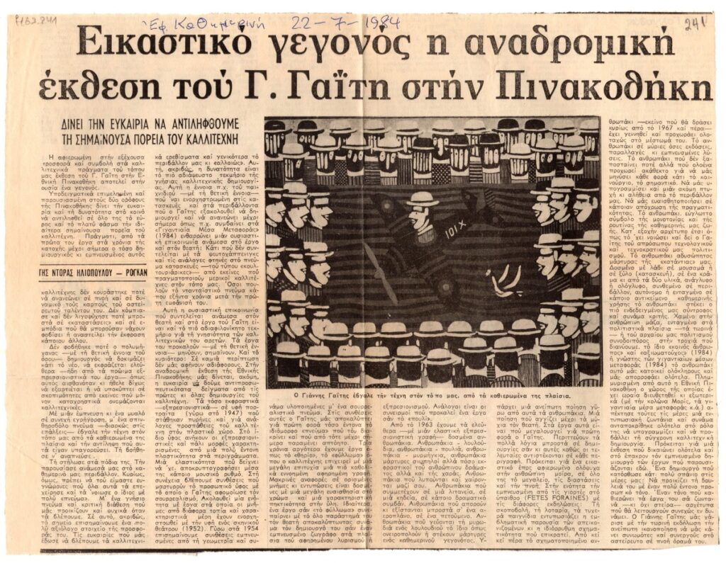 Απόκομμα της εφημερίδας “Η Καθημερινή” (22/07/1984), όπου δημοσιεύεται κριτική έκθεσης του Γιάννη Γαΐτη, η οποία διεξάγεται στην Εθνική Πινακοθήκη Αθηνών.