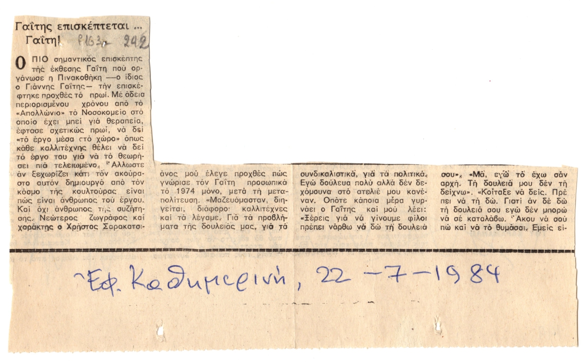 Απόκομμα, χαρτί, 2 φφ, 11,5×19,5 και 5×5 εκ., στα ελληνικά, δημοσίευσης άρθρου το οποίο αναφέρεται σε επίσκεψη του Γιάννη Γαΐτη, σε αναδρομική του έκθεση η οποία διεξάγεται στην Εθνική Πινακοθήκη Αθηνών.