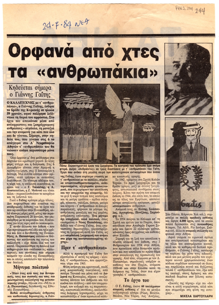 Απόκομμα, χαρτί, 28,5×20,5 εκ., στα ελληνικά, δημοσίευσης άρθρου το οποίο αναφέρεται στη ζωή και το έργο του Γιάννη Γαΐτη, με αφορμή τον θάνατο του καλλιτέχνη.