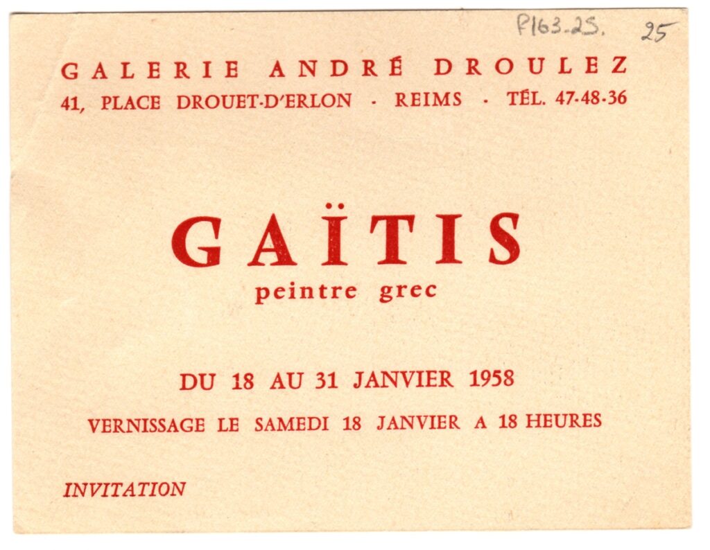 Πρόσκληση, χαρτόνι, 10,5×13,5 εκ., στα γαλλικά, εγκαινίων ατομικής έκθεσης του Γιάννη Γαΐτη στην Galerie André Droulez στη Reims κατά το 1958.