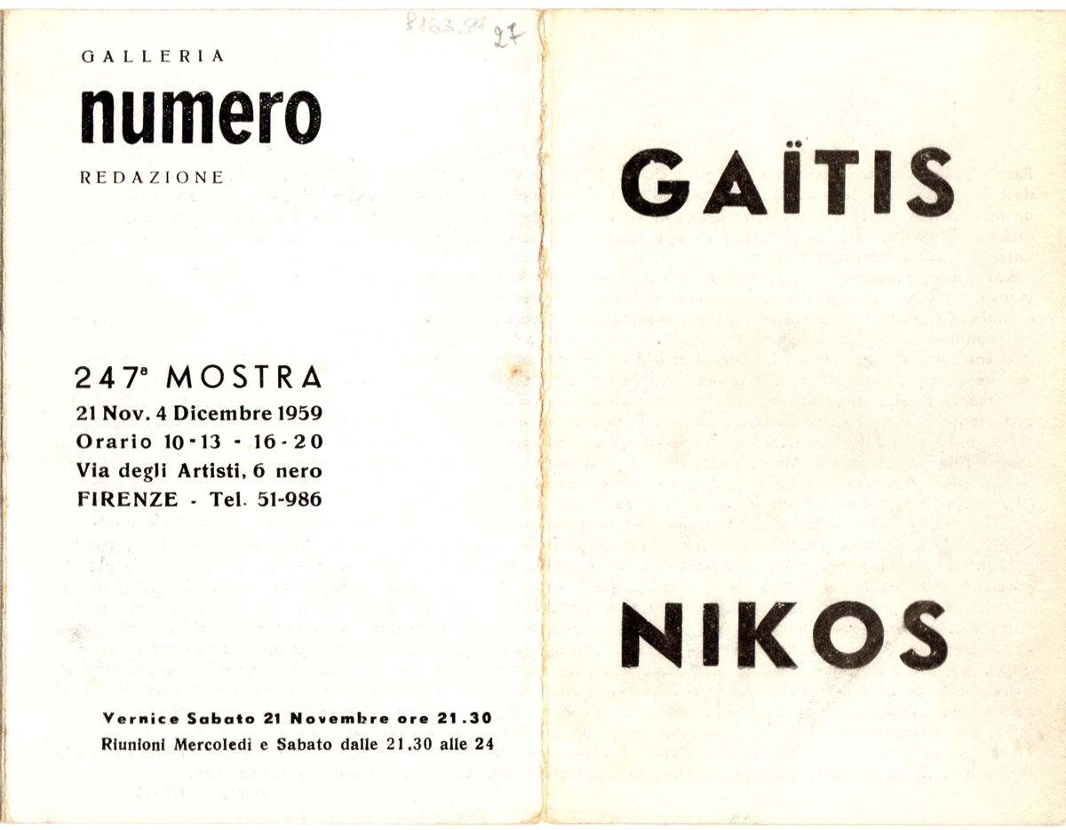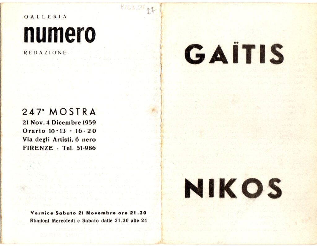 Έντυπο, χαρτί ιλλουστρασιόν τετράπτυχο, 15×10 εκ., στα ιταλικά, ομαδικής έκθεσης των Γιάννη Γαΐτη και Νίκου Κεσσανλή, στο πλαίσιο της 247ης Έκθεσης Φλωρεντίας. Το έντυπο περιέχει βιογραφικά των καλλιτεχνών, κείμενο του Τώνη Σπητέρη και εικονογράφηση.