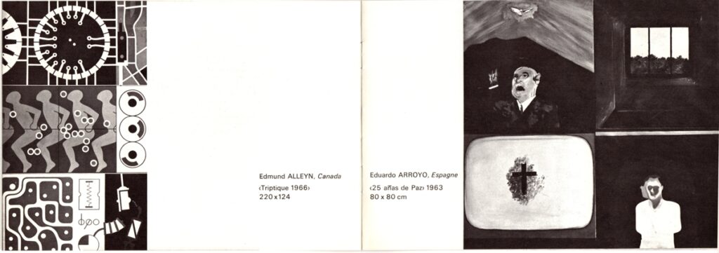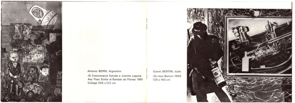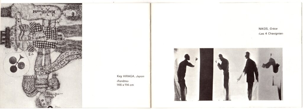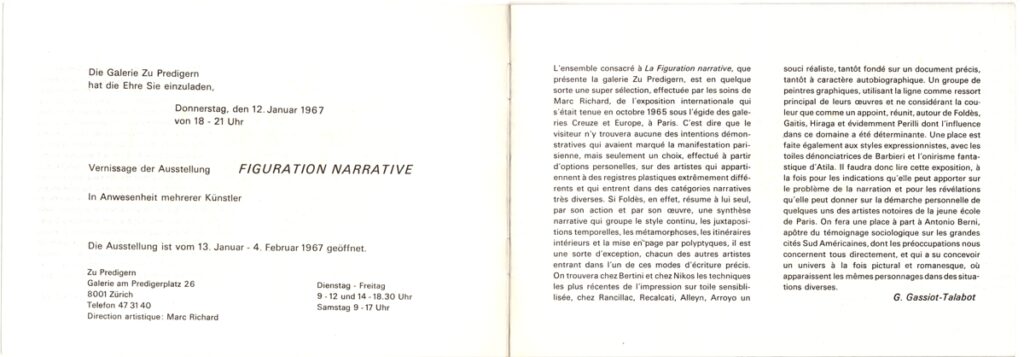 Έντυπο και πρόσκληση εγκαινίων, χαρτί, 8 φφ, 14,5×21 εκ., στα γαλλικά, ομαδικής έκθεσης των Edmund Alleyn, Eduardo Arroyo, Antonio Berni, Peter Foldes, Key Hiraga, Bernard Rancillac, Antonio Recalcati, Atila Frankreich, Eugenio Barbieri, Gianni Bertini, Yanni Gaitis, Nikos, Achille Perilli, στην γκαλερί Zu Predigern κατά το 1967. Το έντυπο περιέχει εισαγωγικό κείμενο και εικονογράφηση.
