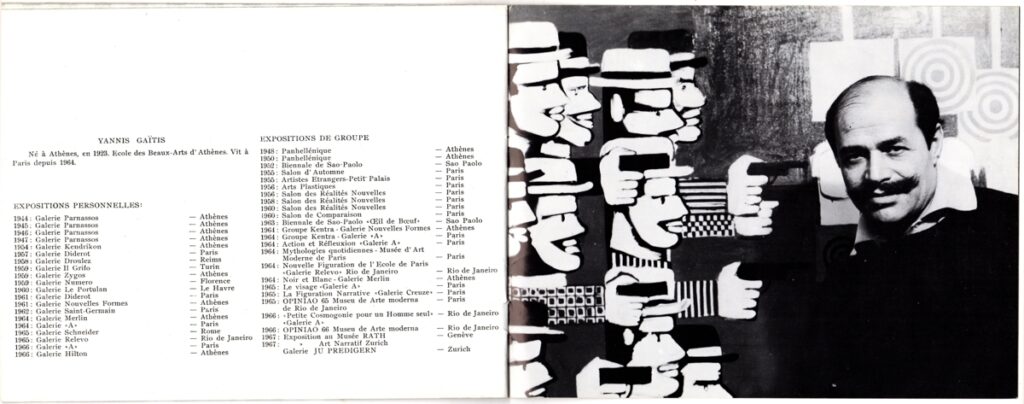 Έντυπο, χαρτί ιλουστρασιόν, 16σέλιδο , στα γαλλικά, ατομικής έκθεσης ζωγραφικής του Γιάννη Γαΐτη, στην Galerie Merlin. Το έντυπο περιέχει κείμενο για τον καλλιτέχνη και το έργο του και εικονογράφηση. Στο έντυπο αναφέρονται τα ονόματα των συλλεκτών στους οποίους ανήκουν τα έργα. Πρόκειται για τους: Davis, Dimitropoulos, Dougénis, Irinis, Karakalos, Kyparissi, Panoutsou, Varkarakis.