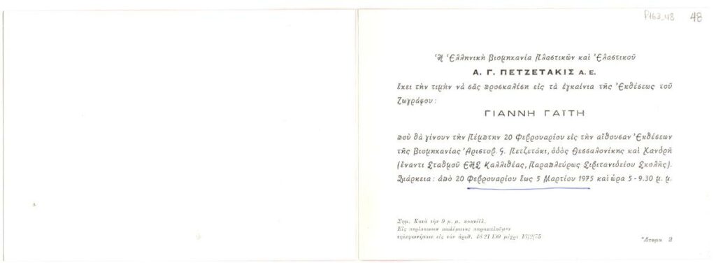 Πρόσκληση εγκαινίων ατομικής έκθεσης του Γιάννη Γαΐτη στην Αίθουσα Εκθέσεων Βιομηχανίας Αριστόβουλου Γ. Πετζετάκι στην Αθήνα.